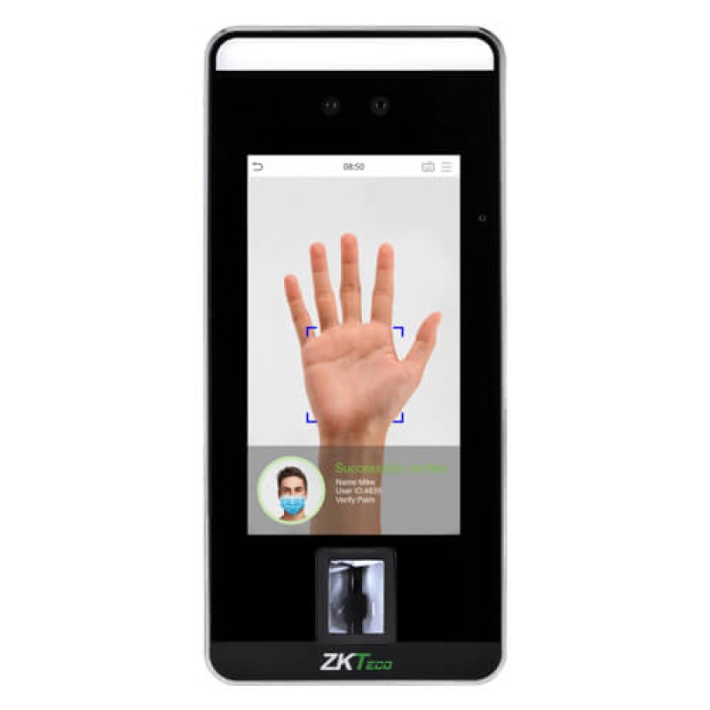 SpeedFace-V5L [P] adopts touchless recognition technology and masked individual identification which eliminates hygiene concerns effectively. It is also equipped with ultimate antispoofing algorithm for facial recognition against almost all types of fake photos and videos attack. Importantly, the 3-in-1 palm recognition (Palm Shape, Palm Print and Palm Vein) is performed in 0.35 sec per hand; the palm data acquired will be compared with a maximum of 3,000 palm templates.